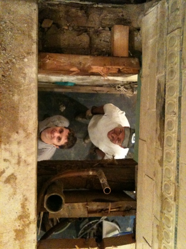 It’s a little Alice In Wonderland/ Twilight Zone in the house right now. We’ve got pipes going up and down but connected nowhere, ducts going side to side but sending air nowhere, posts and beams holding nothing up and bricks loose in the wall. Tonight sand fell out of the wall, and I took this pic thru the bathroom floor… Dunudunu dunudunu