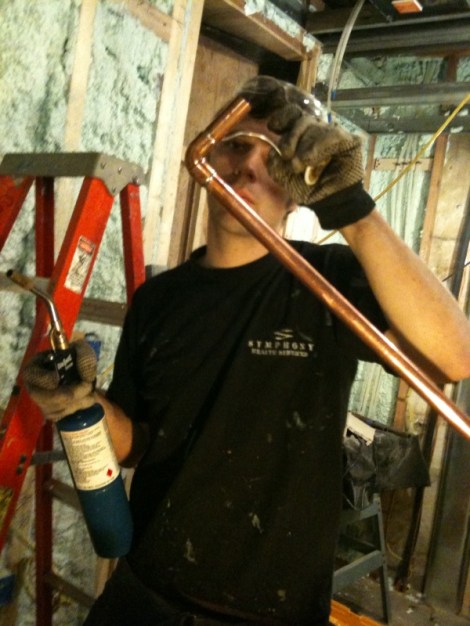 Plumbing Pro November 19, 2009 · by madisonsquare · Bookmark the permalink. · Tonight we roughed-in the entire bathroom! Hot water to both sinks, shower head and tub, Cold to sinks, toilet, tub, shower head… Lots of pipe… Here’s the plumber at work! Share this: Click to email a link to a friend (Opens in new window) Email Click to share on Facebook (Opens in new window) Facebook Click to share on Pinterest (Opens in new window) Pinterest Like Loading... Related