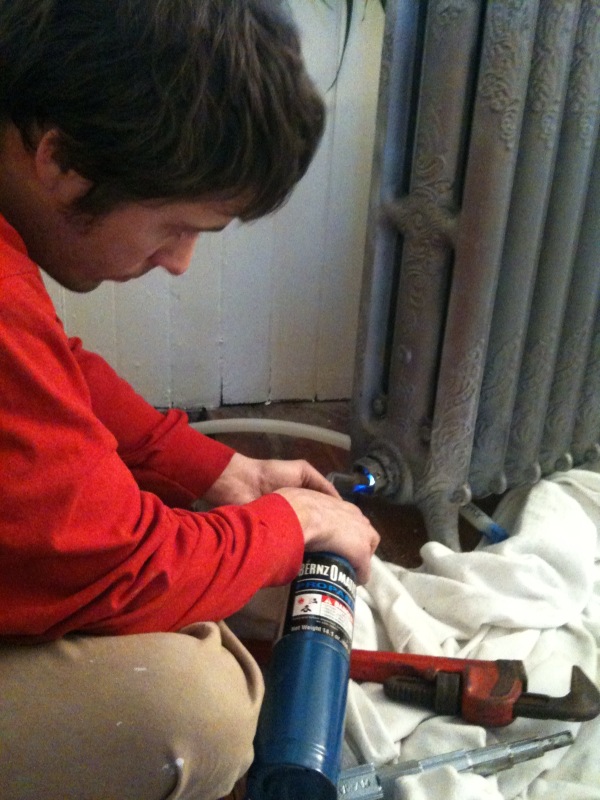 A Difficult Spud December 19, 2009 · by madisonsquare · Bookmark the permalink. · This particular radiator spud is making us a lil upset, so Rob is desperately trying everything in our arsenal to loosen it up. If it won’t come out, we can’t hook up the radiator. Why are the last ones the most difficult ones? Share this: Click to email a link to a friend (Opens in new window) Email Click to share on Facebook (Opens in new window) Facebook Click to share on Pinterest (Opens in new window) Pinterest Like Loading... Related