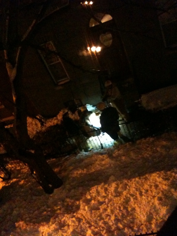 … only to finally arrive at our doorstep across from this scene… a gas leak- our neighbor called Rob’s dead (AT&T/ iPhone issue) phone letting us know there was a gas leak on the block. So these poor workers are in the cold digging away under the walkway across the garden 😦