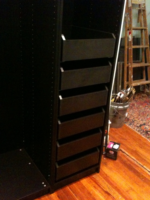 We also put up the curtain, and built custom shelves on top of the standard height wardrobes. Now just need to install the rest of the drawers rods and shelves…