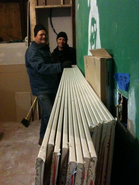 We got a lot done this weekend! Just to give an idea: fixed the three leaks we discovered once the radiators filled up, ran the last speaker wires, adjusted a few receptacles and lights, insulated all the hot water pipes, some cold water pipes and the ceiling of the kitchen, framed in around the kitchen windows, finished furring out the ceiling, fixed some big squeaks in the hall floor, cleaned the woodpile out in the basement, hung drywall in the first floor closet, cleaned up, and picked up a TON of drywall from the crazies at Home Depot in So Philly (shown here stacked in the living room after carrying it all up Mad Square in this cold windy weather which is *not* a perk of living on a garden block…) All of this of course took much longer than expected- we are going to be spending the evenings of the first week of January drywalling the kitchen 🙂