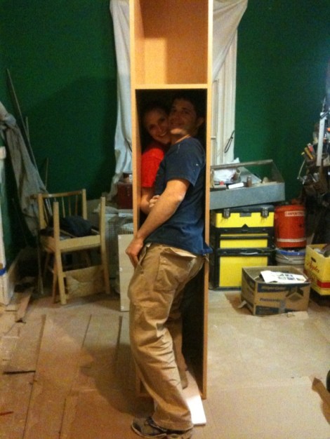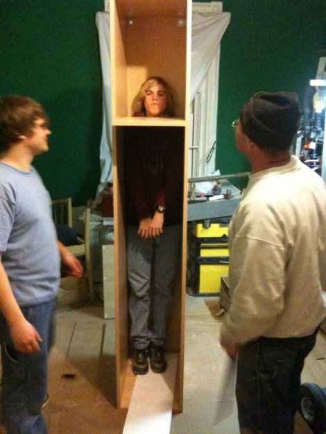 We can’t seem to stop having fun despite the riviting/grueling tasks at hand. Here we are squished in our pantry cabinet: