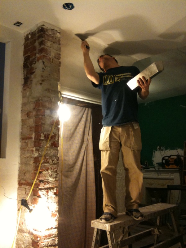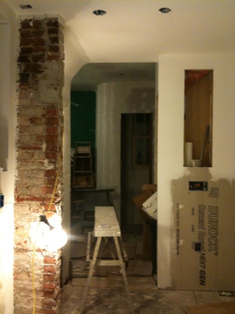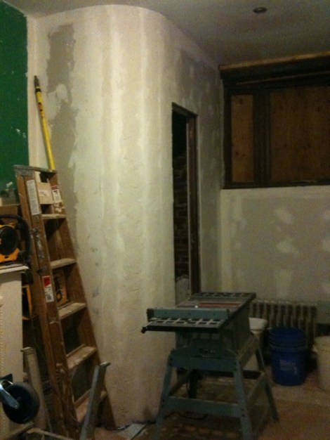 Plaster and Mud and Paint! January 18, 2010 · by madisonsquare · Bookmark the permalink. · Besides cabinets we worked hard this we weekend on our walls- the kitchen walls are primed and the ceilings painted! No small feat. Kitchen to Living Room: The curved wall is getting there: Share this: Email a link to a friend (Opens in new window) Email Share on Facebook (Opens in new window) Facebook Share on Pinterest (Opens in new window) Pinterest Like Loading... Related