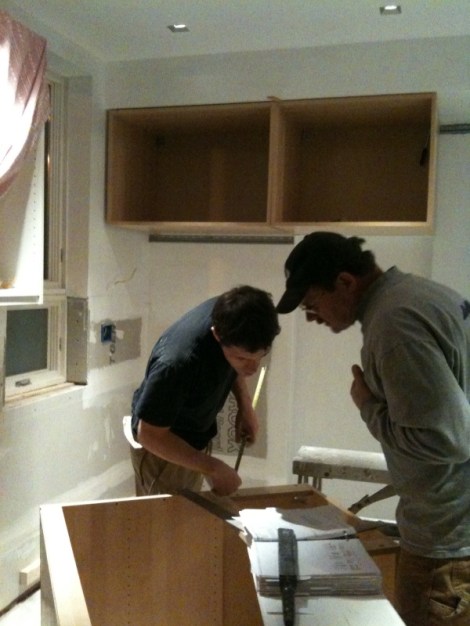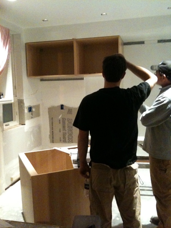 Tonight after I painted the last ceiling coat in the kitchen the guys got going on some more cabinets: