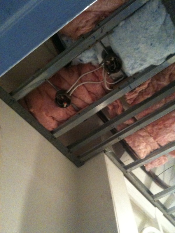 Then I insulated it with a lovely combo of blue soft fuzzy insulation and pink itchy Fiberglas insulation for sound reasons not aesthetics: