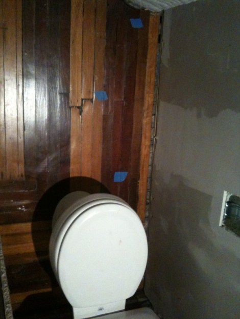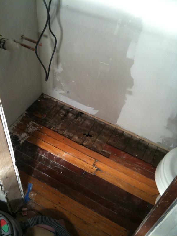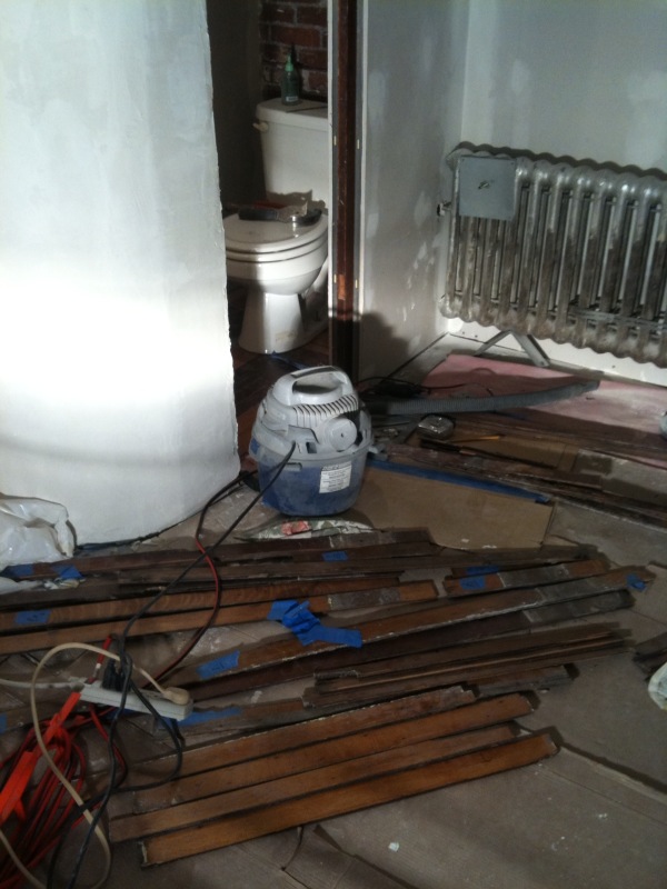 Tonight Rob fixed the hardwod floor in the half bath (there were a few holes from the old radiator location and where the closet walls were) In progress: