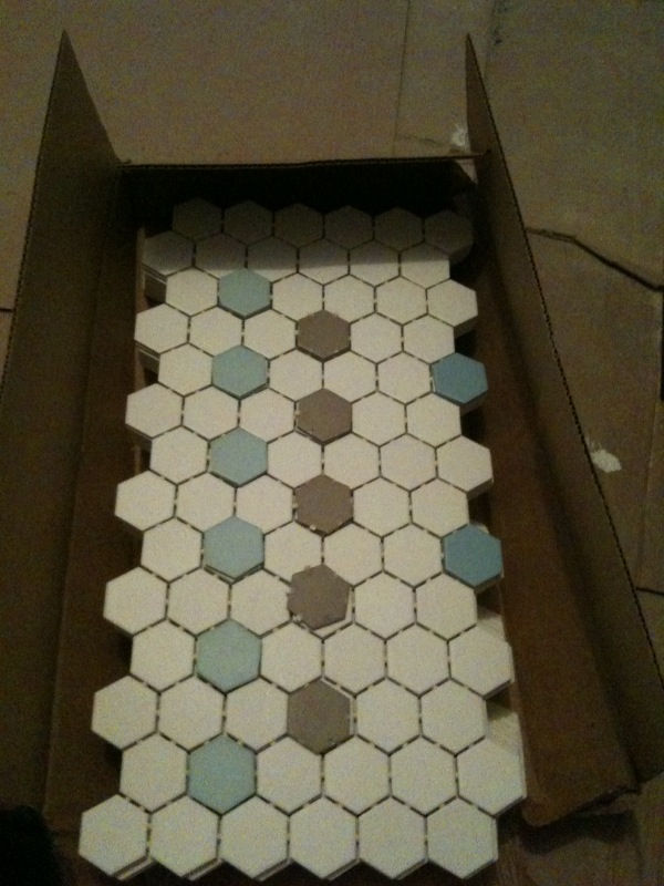 Actually we picked it up a few blocks from our house on Washington Ave, the go-to street for contractor showrooms. This was the longest tile order in the history of tile, mostly because of the “uptown taupe” tan hex accent tile… But it’s here now and that’s what matters.