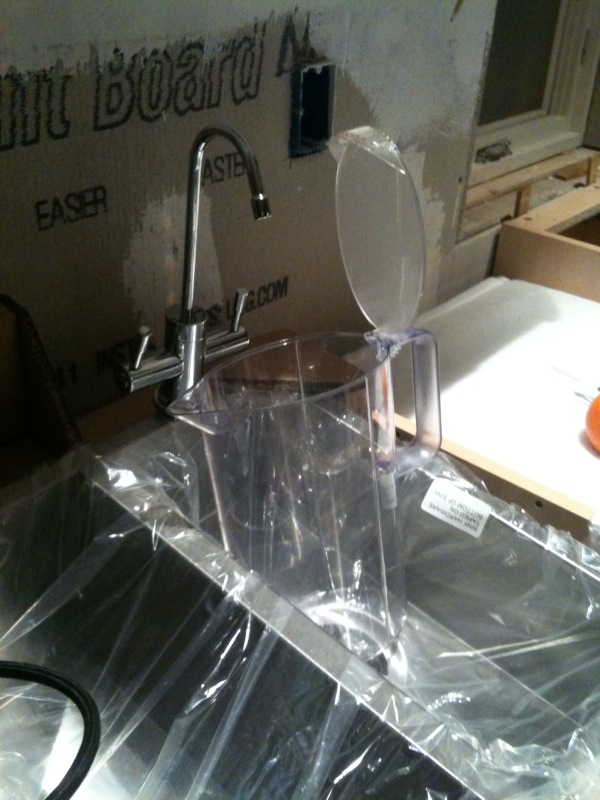 Our dual basin stainless sink, the techy pull out faucet and a temporary stand in for the instant hot/cold dispenser. Turns out the one we got (shown here) doesn’t work with our system- another one’s on it’s way. The new one looks completely different, is a little smaller and we ordered it in matte black instead of chrome to fade away into the dark counter instead of calling attention to it. The other intent is to complement the black accents on the main faucet.