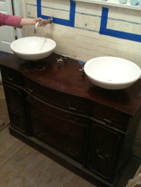 The vessel sinks will sit partially into the vanity; blue tape is outlining the mirrors; scratched wood top will be replaced with marble. We decided to put the cross handled hot/cold faucet controls in the counter just like they look here: