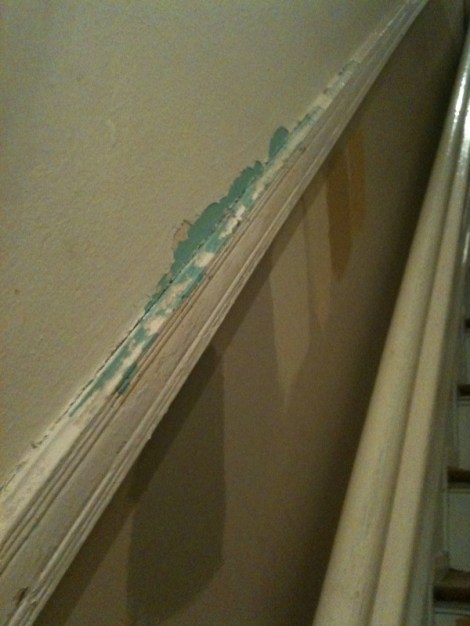 And I worked on scraping the mantle some more and then took a literal stab at the stair trim: