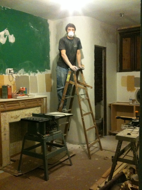 I wouldn’t blame you if you assumed all we did tonight was move tools around. but No! Rob sanded & spackled the last bit of the curved wall and other miscellaneous spots in the house: