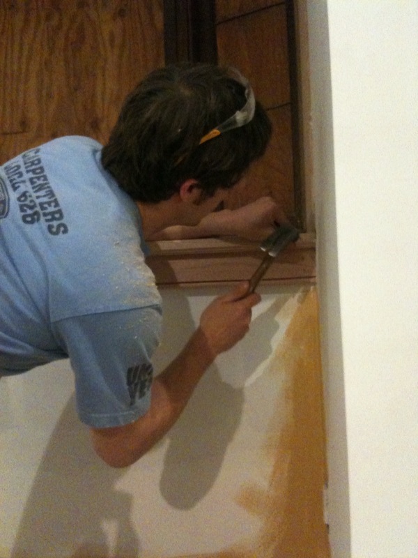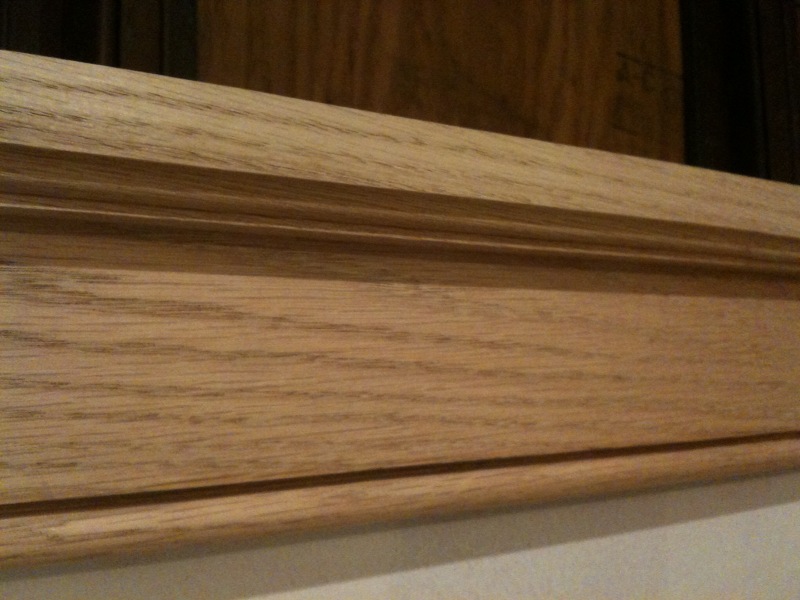 Then he cut and routed the jambs (sides), casing (above window), and apron (under window) in two pieces shown here: