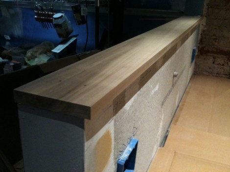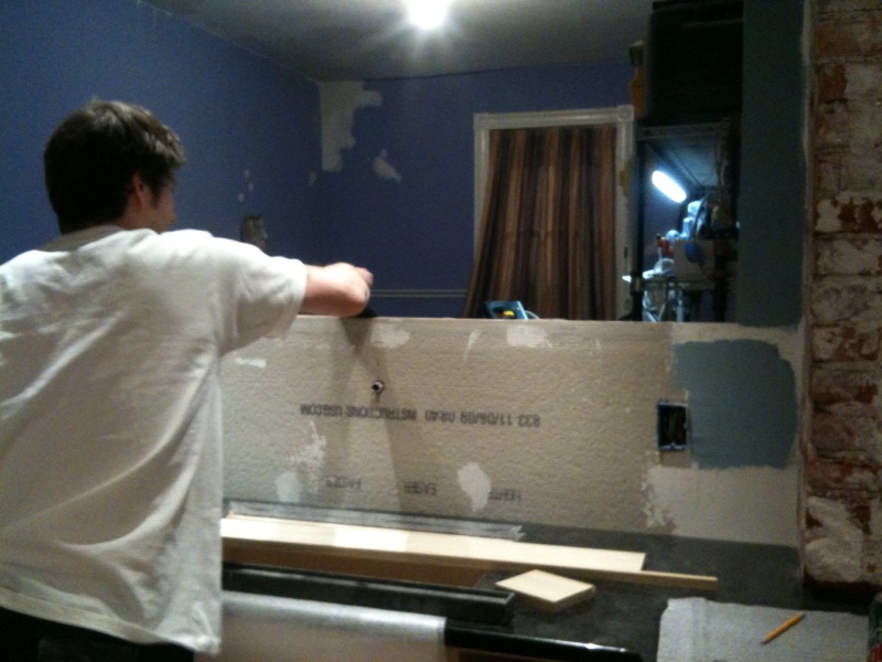 The height of this wood cap was a serious hot topic in the early stages of kitchen planning. It plays a critical role throughout the kitchen as the top height of the tile waincot/backsplash which relates to window sills which relates to counter heights and toe kick heights and flooring thickness. Throw in the fact none of these things existed when we built the wall back in… October? November? And you realize how critcal it is to plan ahead… Only to find out 12″x12″ of tile mosaic is more like 11-3/4″ x 11-3/4″ and hmm. It’s also important to be flexible.