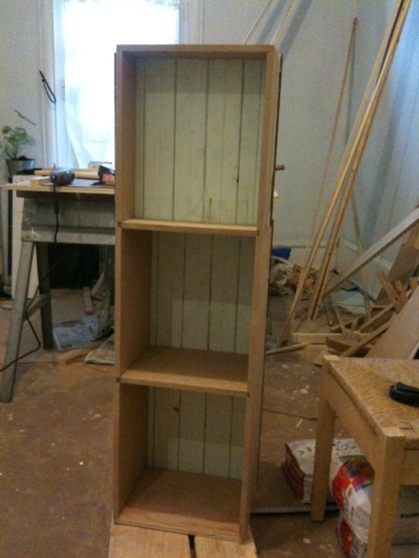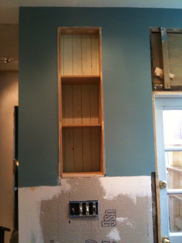 The beadboard in the back was salvaged from the old dining room closet. The top shelf is shallower to accomodate some unavoidable plumbing.