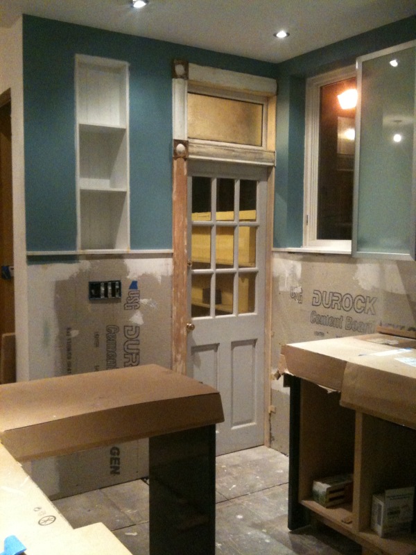 …and the rest of the horizontal trim at the top of the tile wainscot. I primed the bookshelf tonight too: