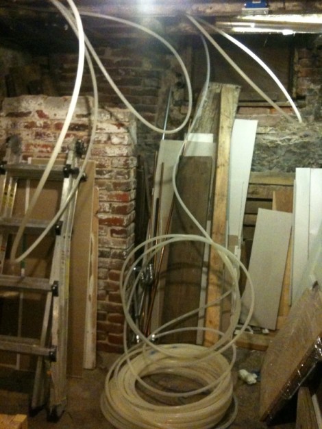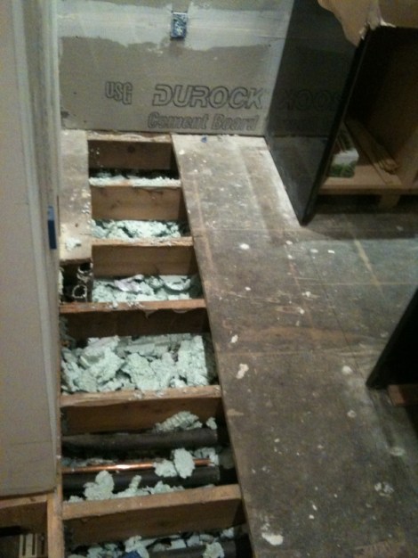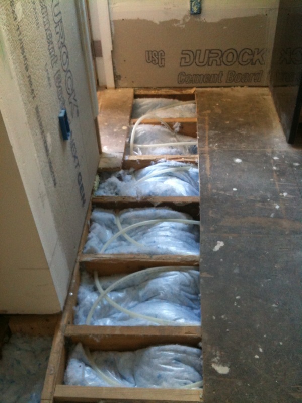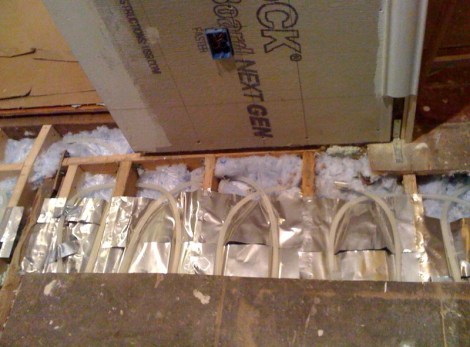 Oh yeah, we installed the radiant floor in the kitchen on Sunday! Pex was run and hooked up to the boiler and here’s how it went down:
