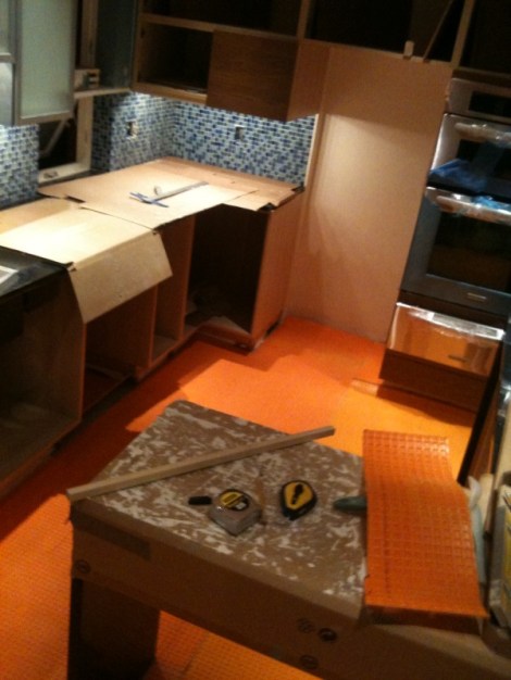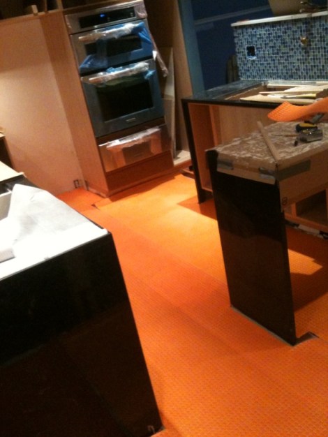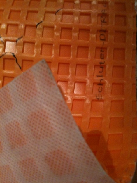 It’s Ditra, a product made by Schluter and sold in rolls. So far we’ve found it easy to cut and transport, less mess than cement board, and thinner too (so, less of a transition to our other rooms). If there has to be a con, it’s that it’s more expensive: