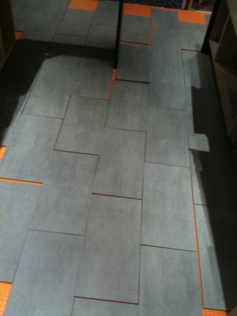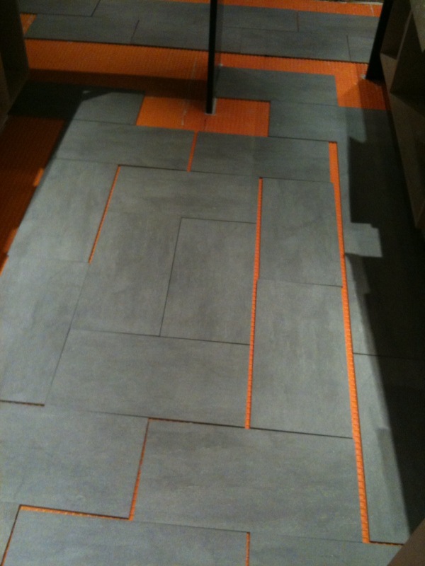 Tonight we tried a lot of tile layouts (without cutting anything) to see what we like best… lots of moving of 12×24 tiles. Unfortunately they don’t slide well on Ditra. We started with a running bond running north-south: