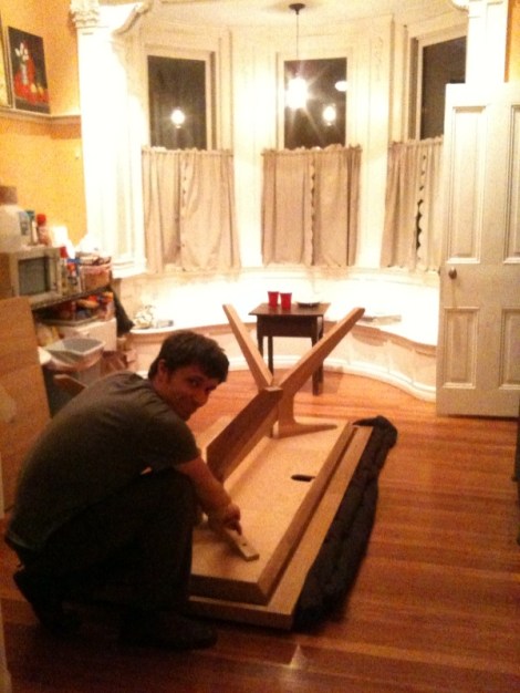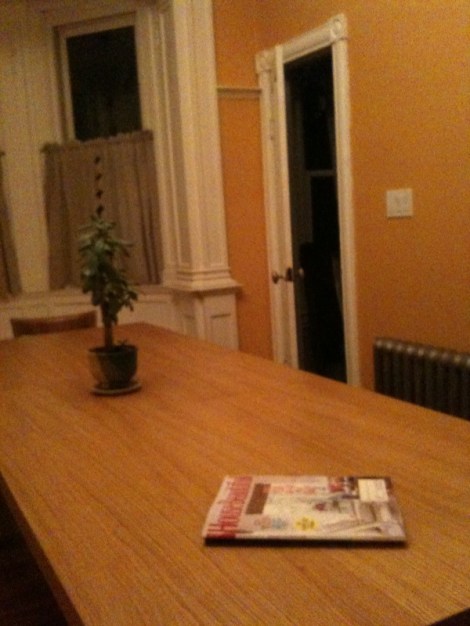 Clearly our actual dining room isn’t ready for our newly acquired table, but it manages to look good anywhere, including our guest room/faux kitchen/ bathtub storage room 🙂