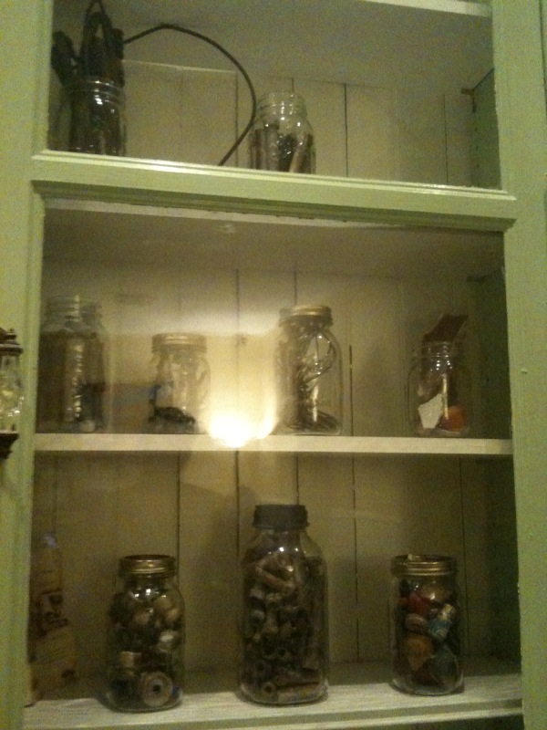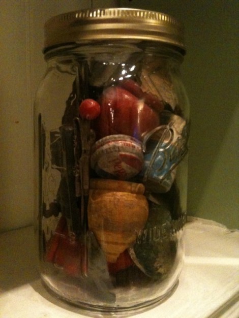 Long story, but we had to empty out the clawfoot tub. Empty it out because thats where we were storing a bunch of fun items we found during the early stages of construction. Check out our sorted treasure jars!