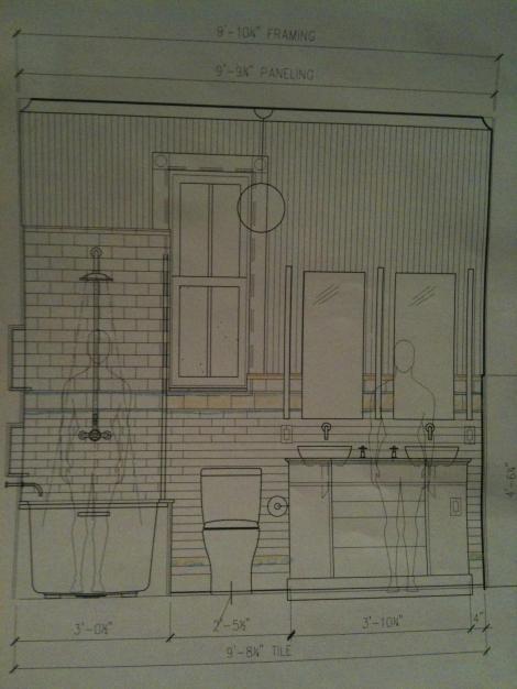 The plan: a new Kohler soaking tub, Toto dual flush toilet, new window, antique vanity with new stone top and partially recessed vessel sinks, hex floor tile over radiant floor, and hydronic towel warmer.