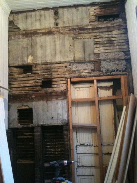 This is a serious looking mess, fortunately it can be ‘fixed’ by demo-ing all the old lath and plaster and starting over with that falling down framing at the old door. Probably finally pull that old door out of the wall too!