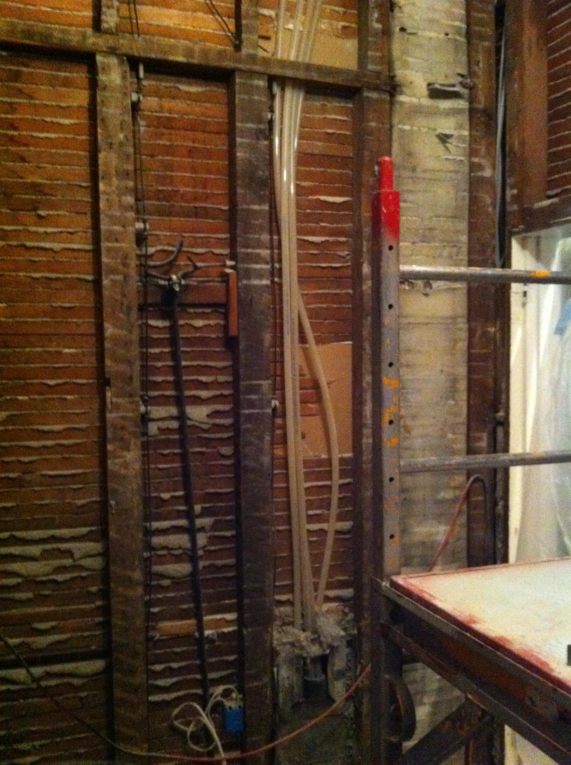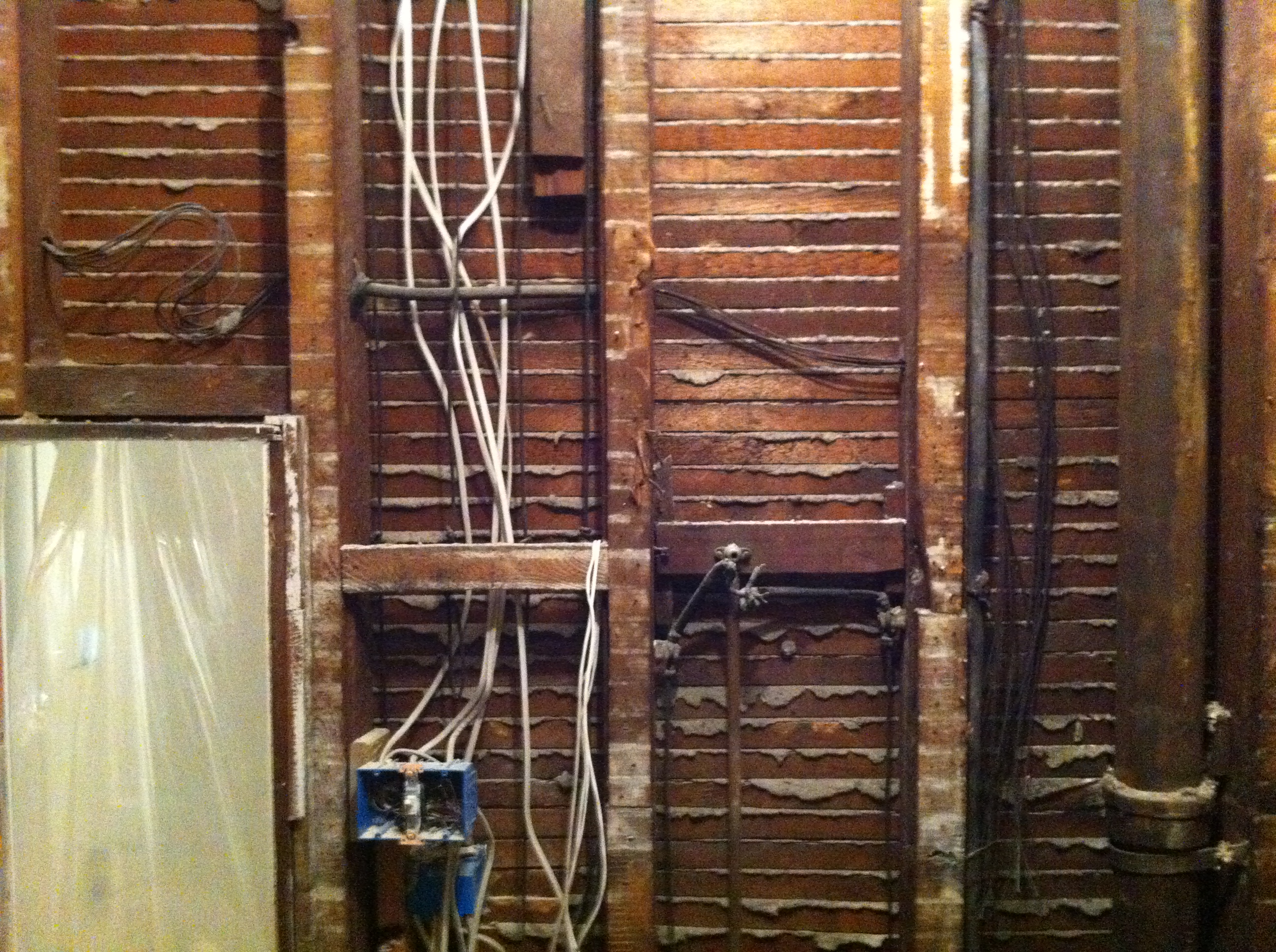 We cleaned everything out on all walls back to the studs… Check out the new wiring, old wiring, old communication cables… Lead pipe for water, gas lines… What a mess but kinda cool: