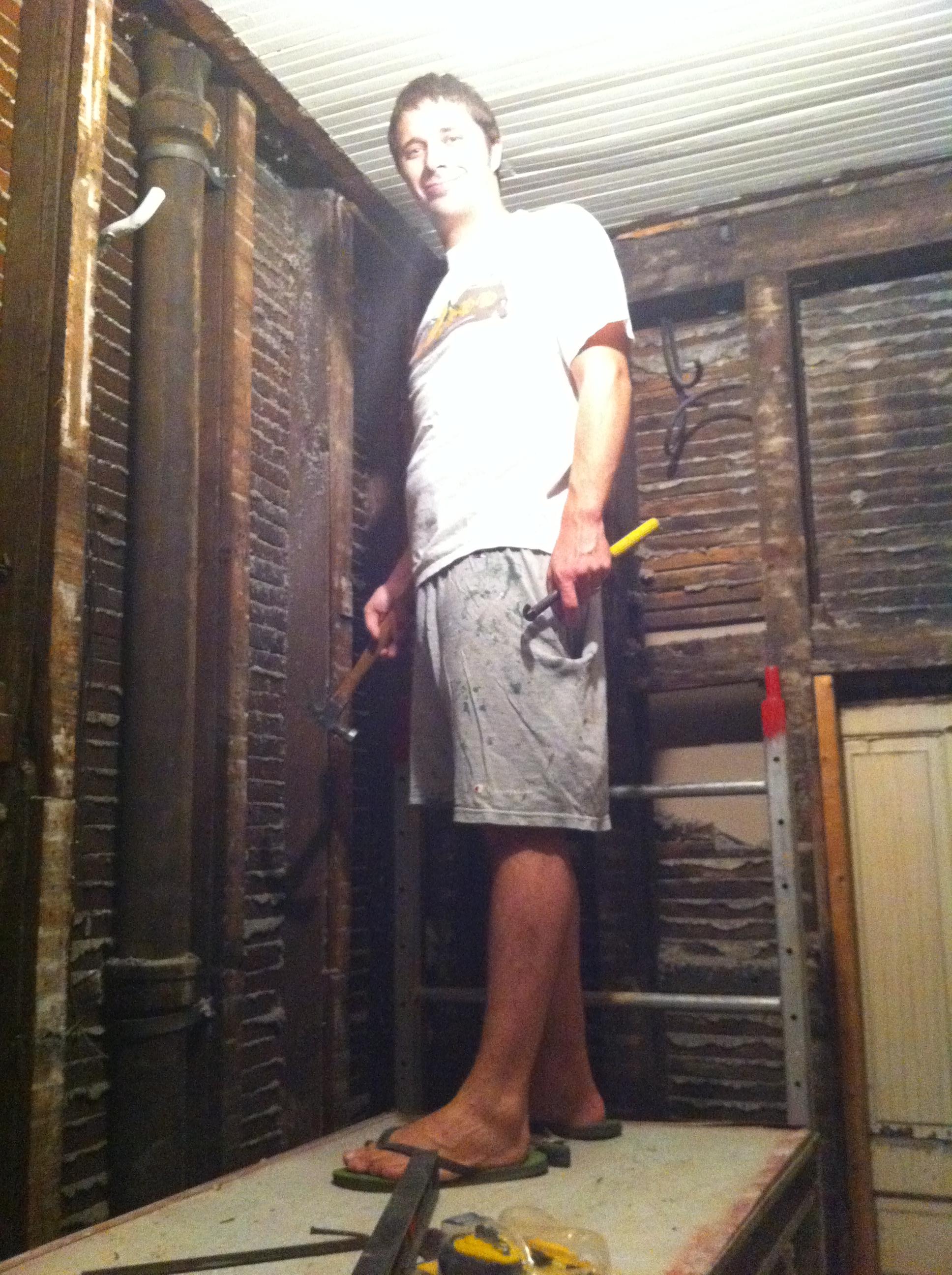 One year later and still holding the hammer… But now with flip flops on a scaffold! Getting fancy now: