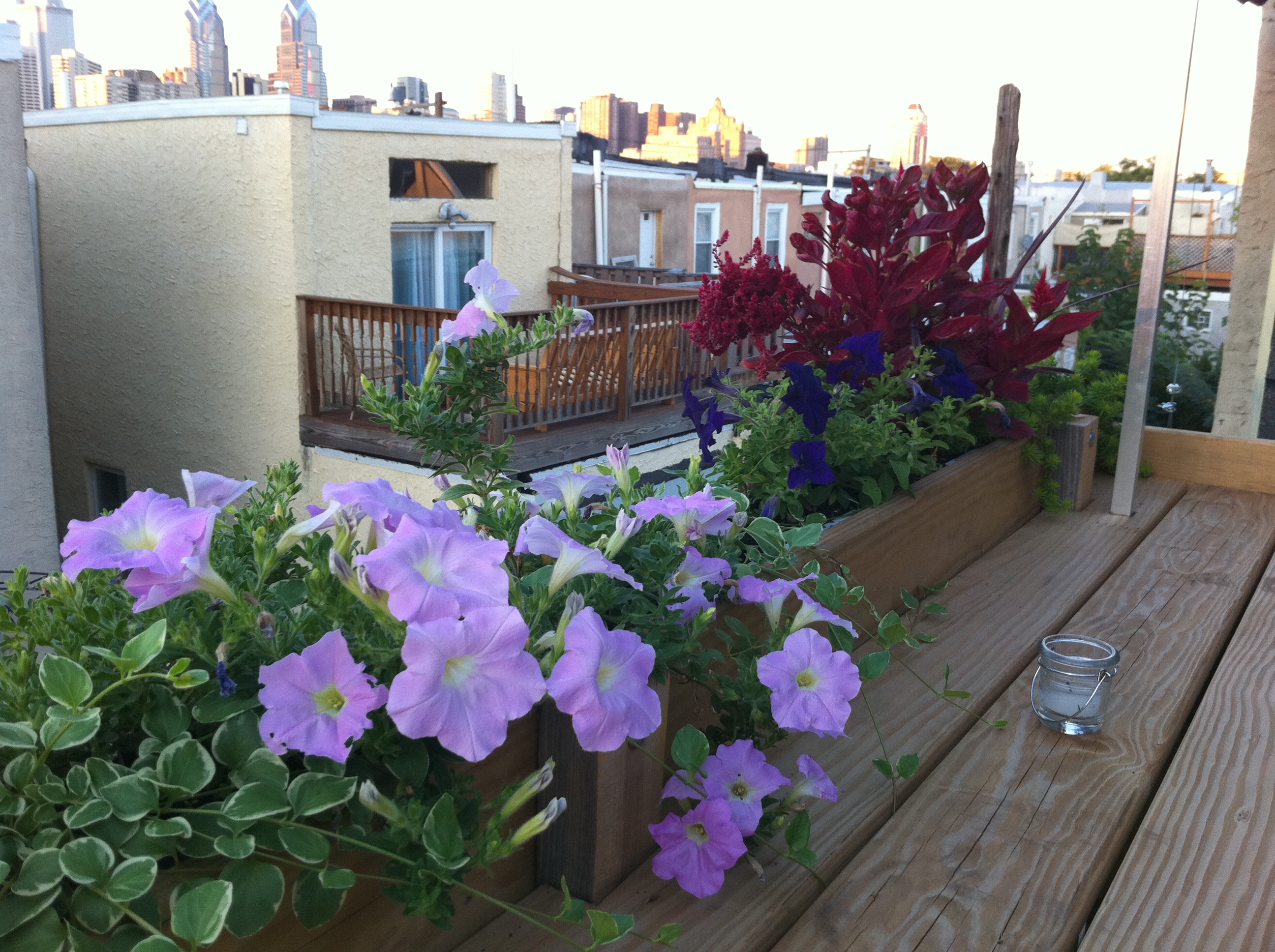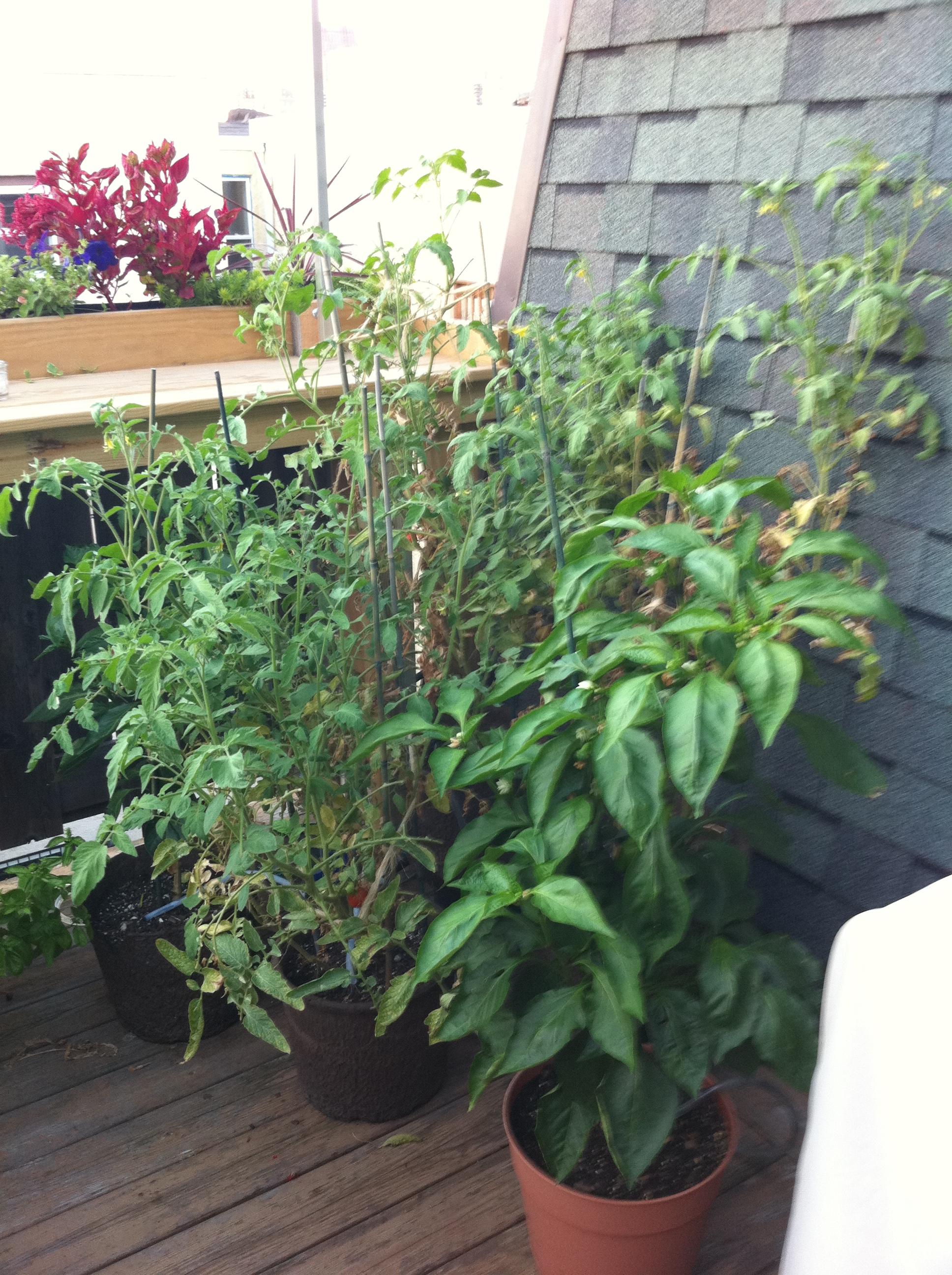 Remember when we had caterpillars on the tomato plants? We think a few mini escapees decided to move on up to the planters. We have been getting delicious tomatoes despite the rude attack: