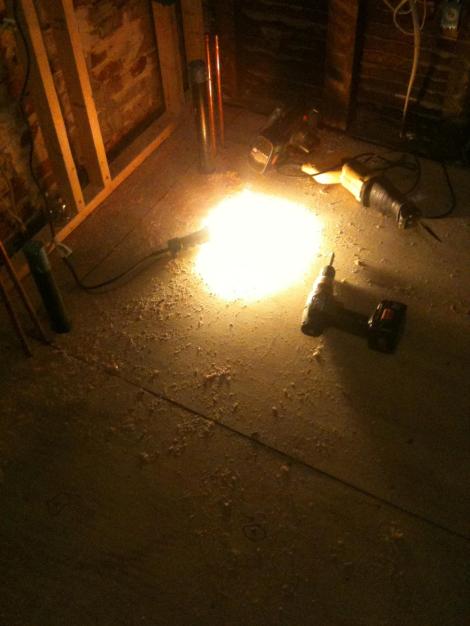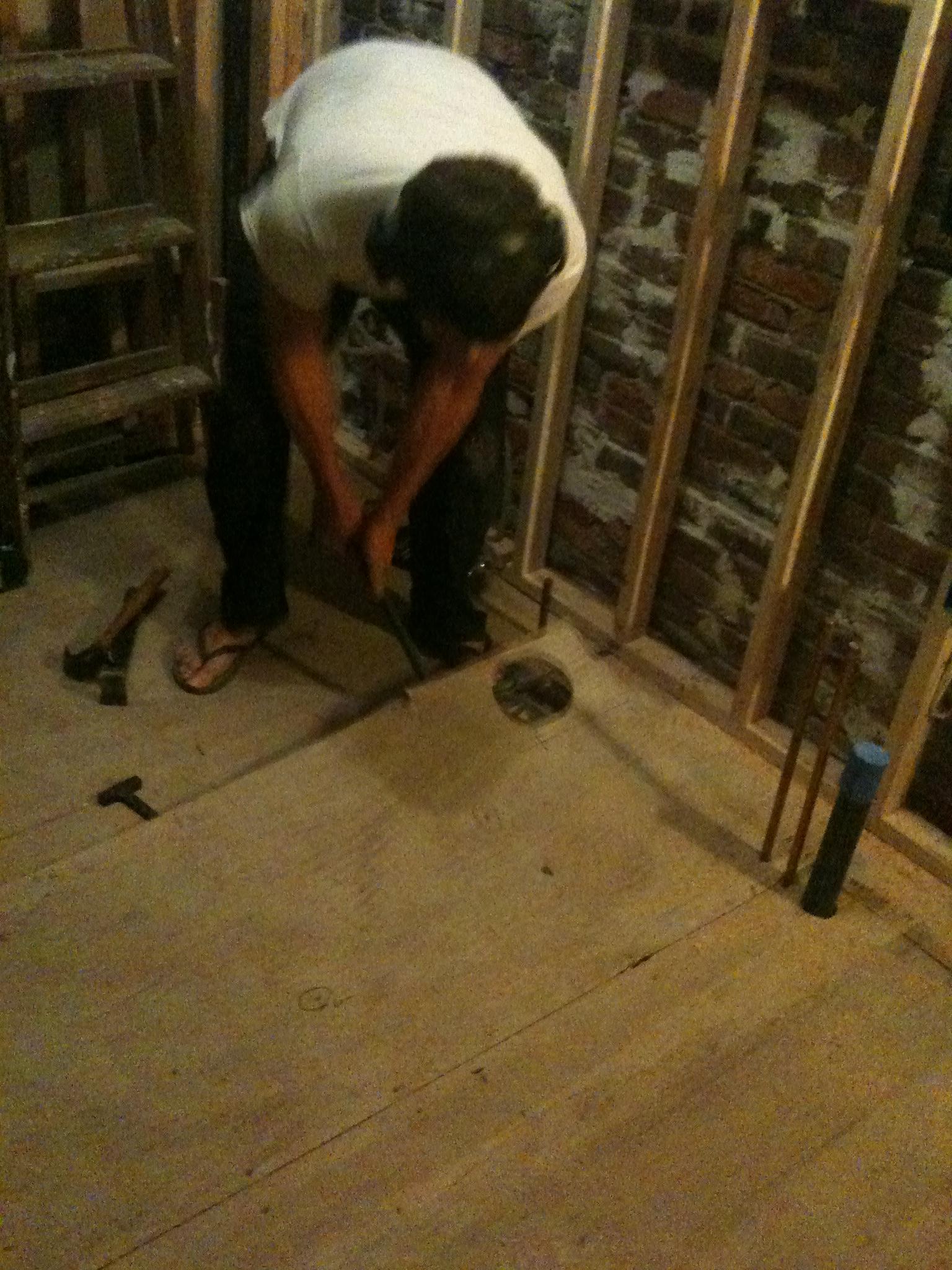 Tonight we started the serious task of pulling up the screwed and glued plywood floor. This step is necessary because we need to install metal plates for the radiant floor but mostly because we need to make some plumbing rough in adjustments, which came about after deciding to buy a new tub.