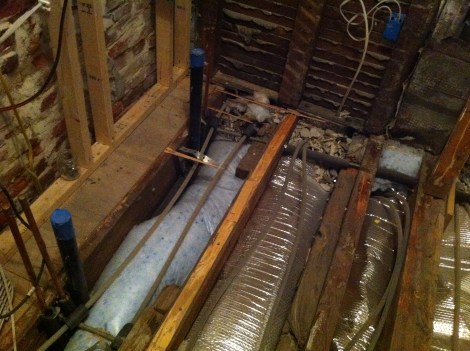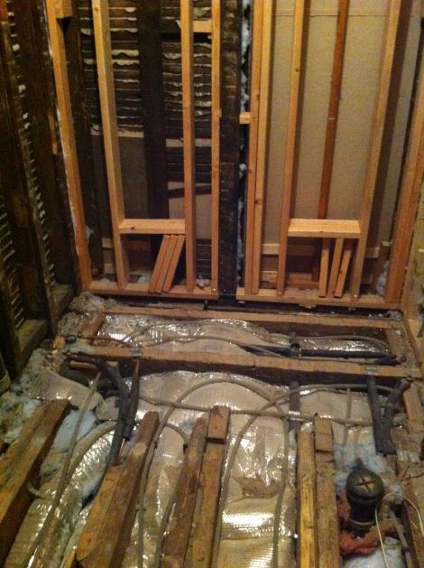 Some of the plumbing rough-ins (blue tape covers the top of the drains, since they are connected to the sewer line but don’t have traps yet):