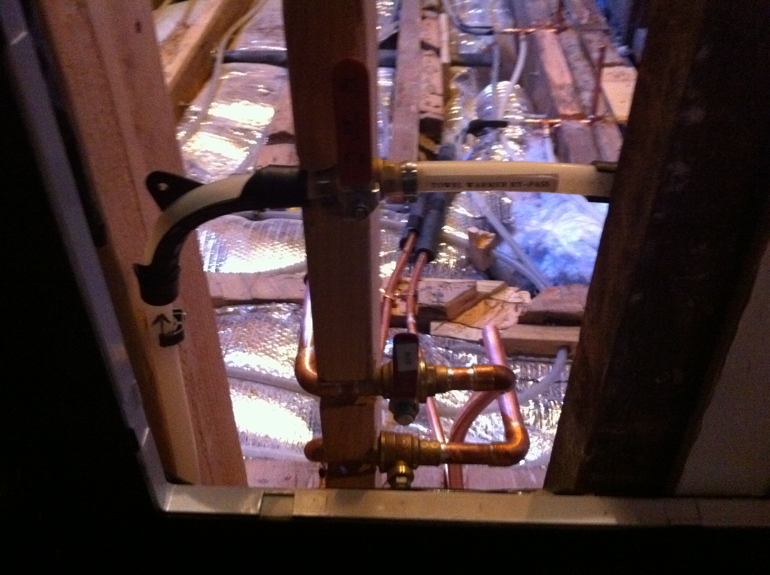 Yesterday, we finished nearly everything that needs to be done under the floor before the plywood subfloor goes back down. Rough-ins for the towel warmer: