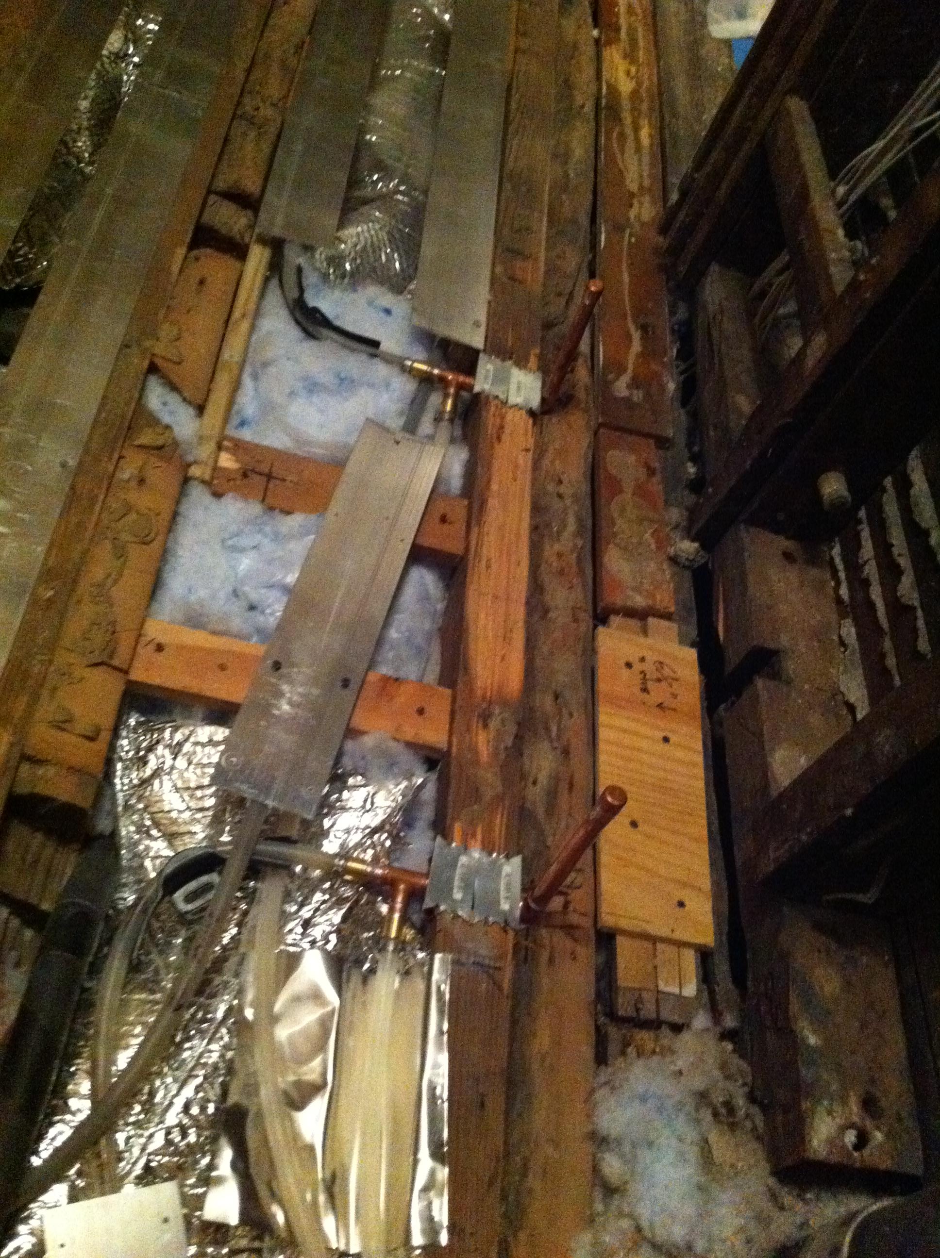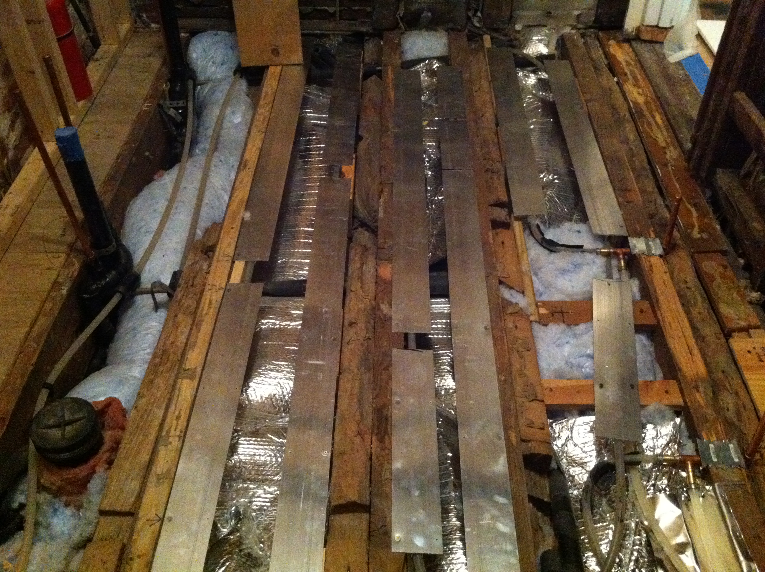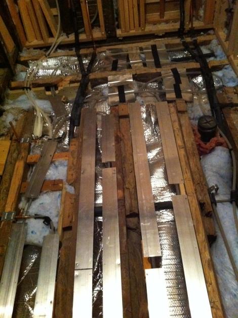 Metal plates on the pex for the radiant floor, and insulating all the hot and cold water copper pipes running thru the radiant floor area (black insulation):