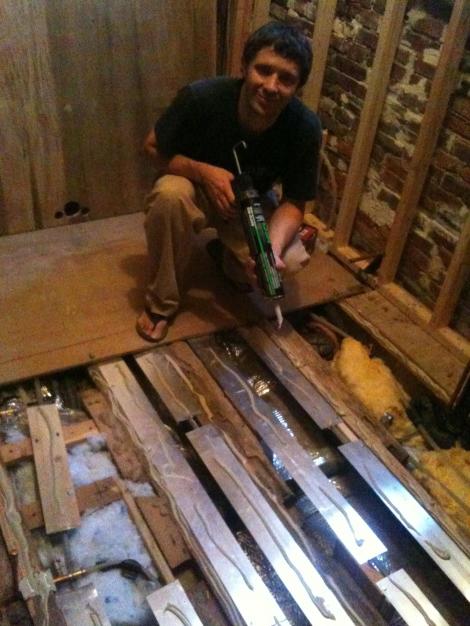 Bathroom Floor, 1 of 3 September 25, 2010 · by madisonsquare · Bookmark the permalink. · Plywood Panel 1 is attached! First the subfloor Adhesive: Then the plywood gets screwed down: I’ll spare you the details of how All our saws decided to refuse to cut today in protest of working in hot weather. Share this: Click to email a link to a friend (Opens in new window) Email Click to share on Facebook (Opens in new window) Facebook Click to share on Pinterest (Opens in new window) Pinterest Like Loading... Related