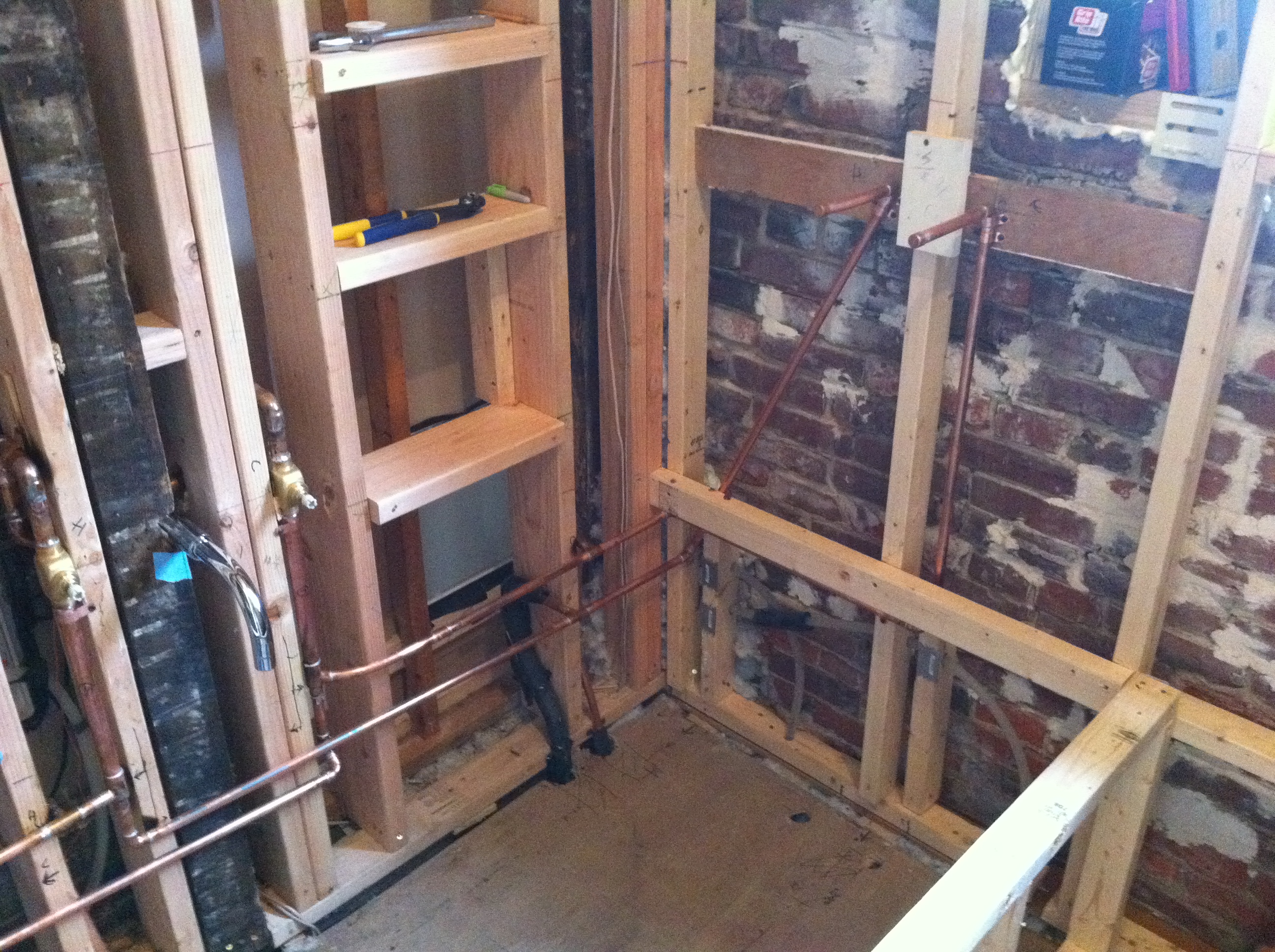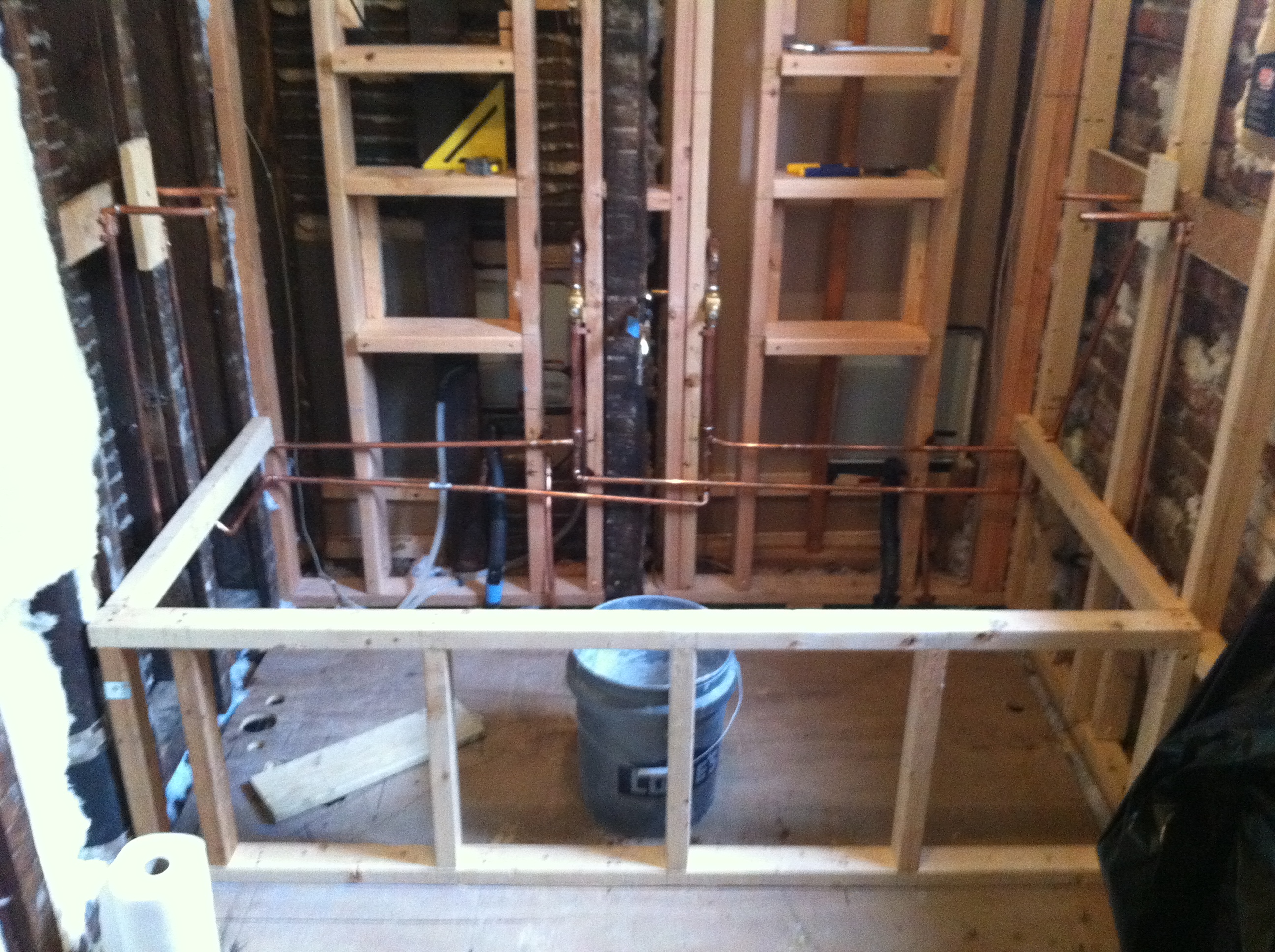 And useful, eventually. Center of pic is tub filler, to the L & R partially up the wall you’ll notice two sets of rough-ins, one for each shower head control: