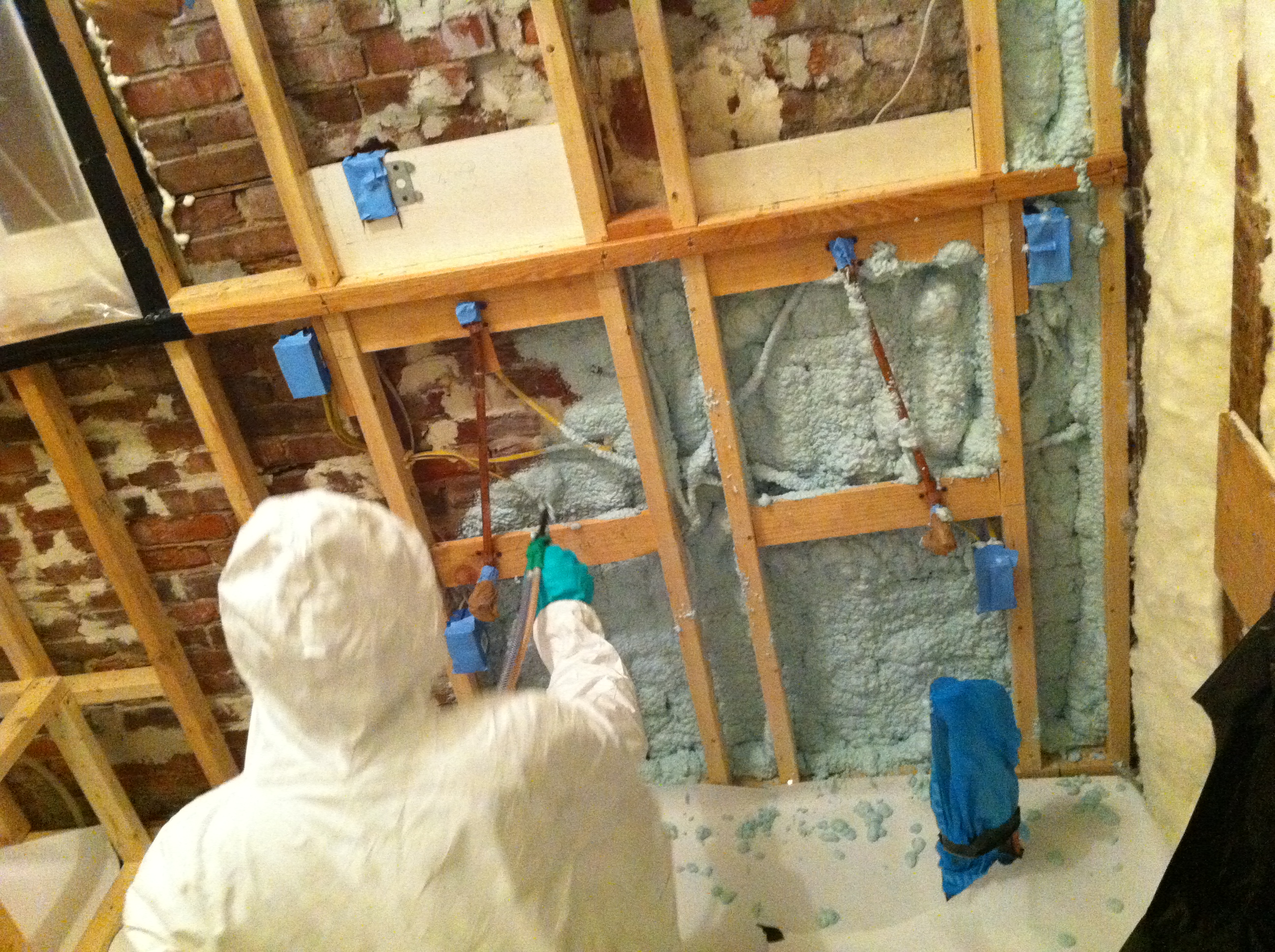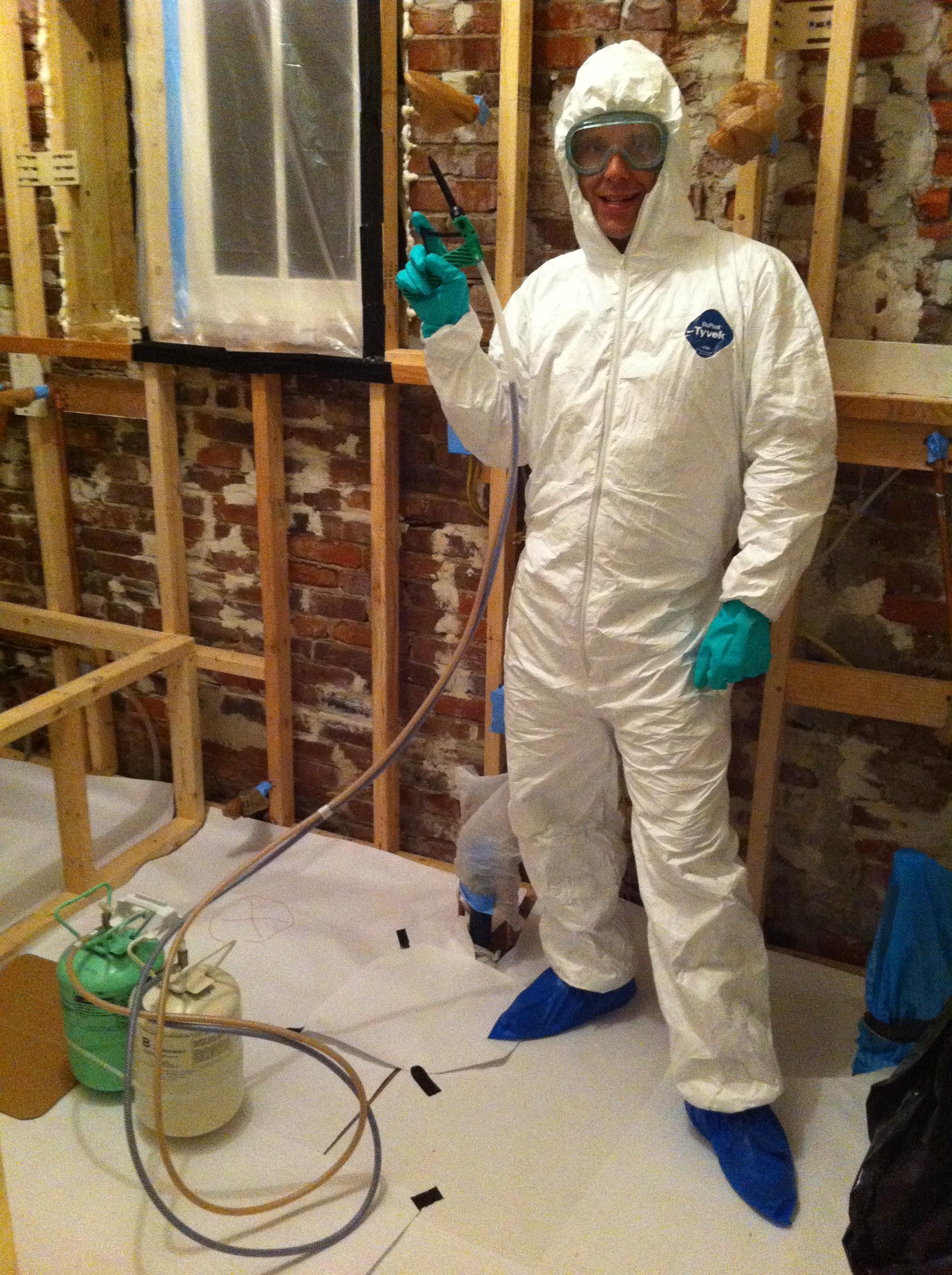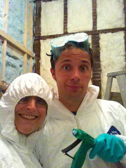 This is our THIRD time spraying foam insulation and now we definitely have the drill down. Tip: Cover EVERYTHING with plastic, paper, or tyvek suit for easy clean up.