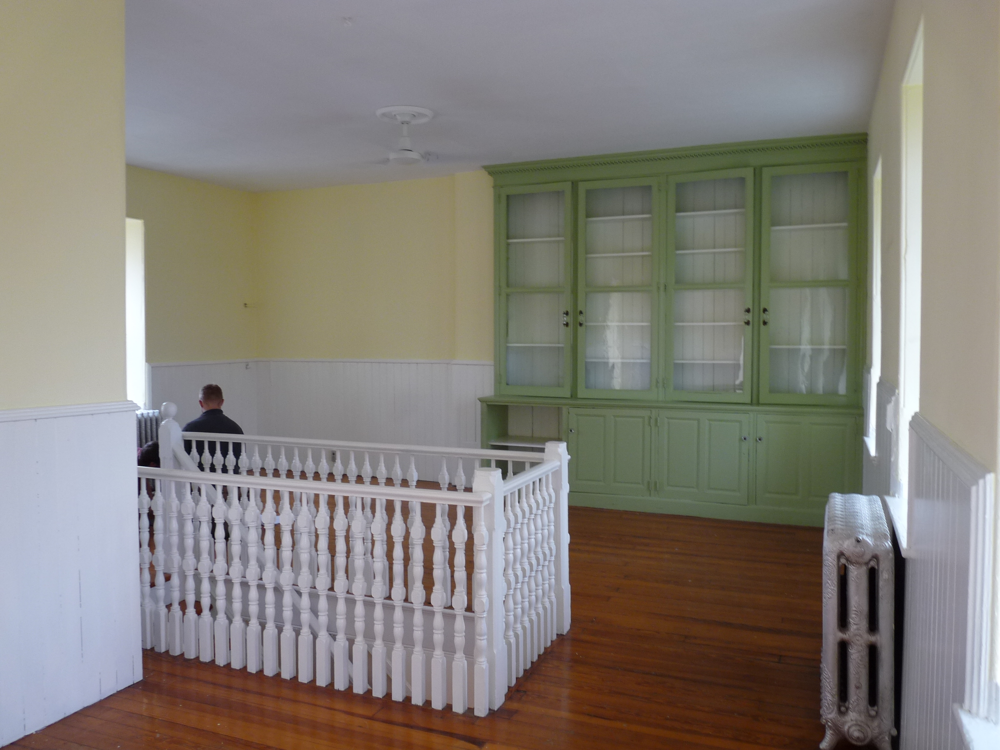 It is hard to sum up our third floor. As the only large open space in the house, with lots of light and cool views, it generally serves many purposes (office, library, tv room, storage, deck access, guest room, where-the-fish-tank-is), so way back when, we set up a poll. So, what won?