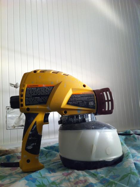 Here’s the new tool we used to get it all done: a paint sprayer. You put the paint in the tub, attach, plug in and spray. We sprayed small areas at a time, then brushed to get a super smooth finish: