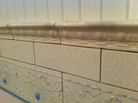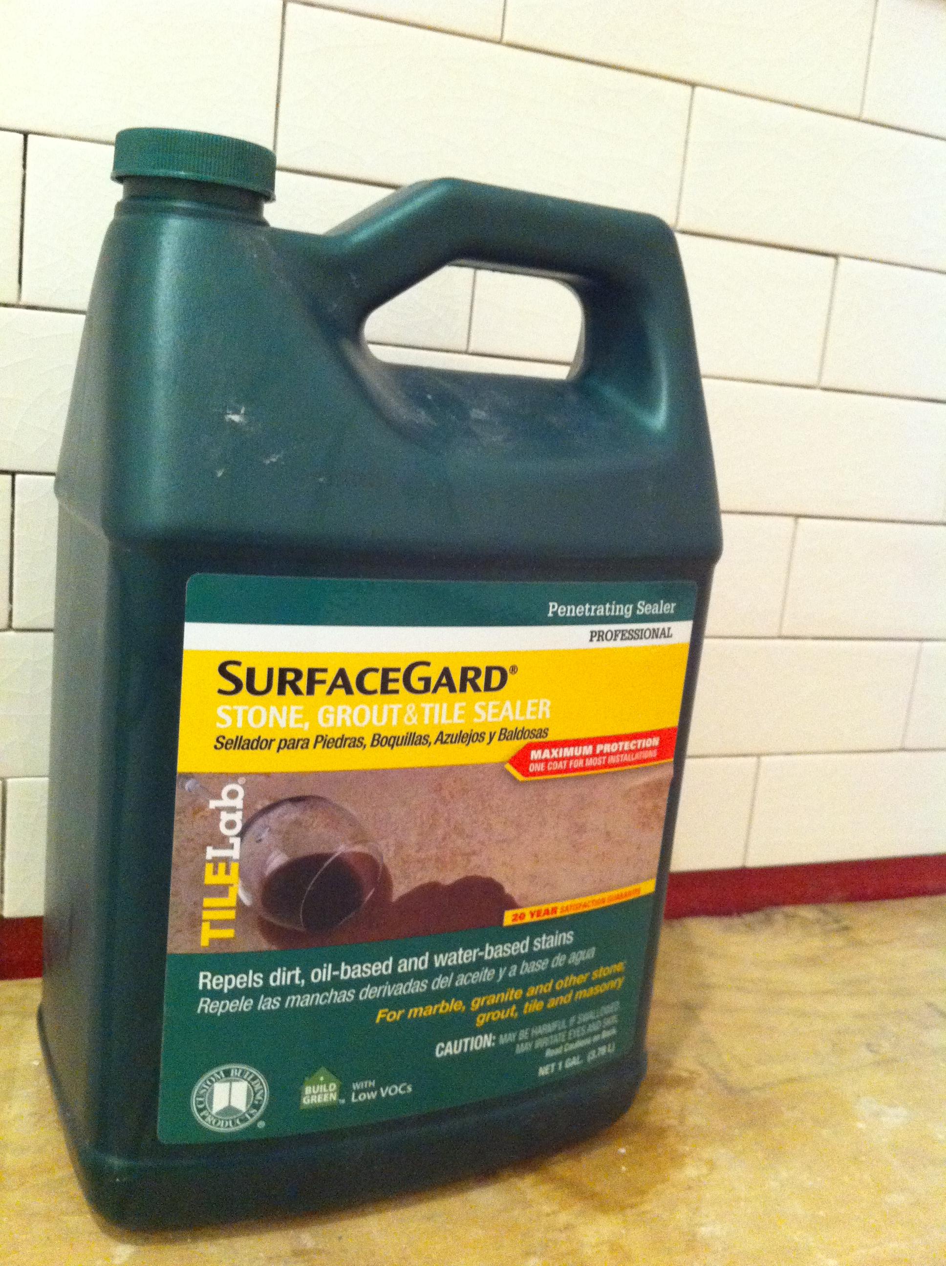 And now moving on to sealing the porous ceramic wall tile with a low VOC sealer that still smells less than fantastic. Sponge on, wipe off, let dry 2 hours, reapply.