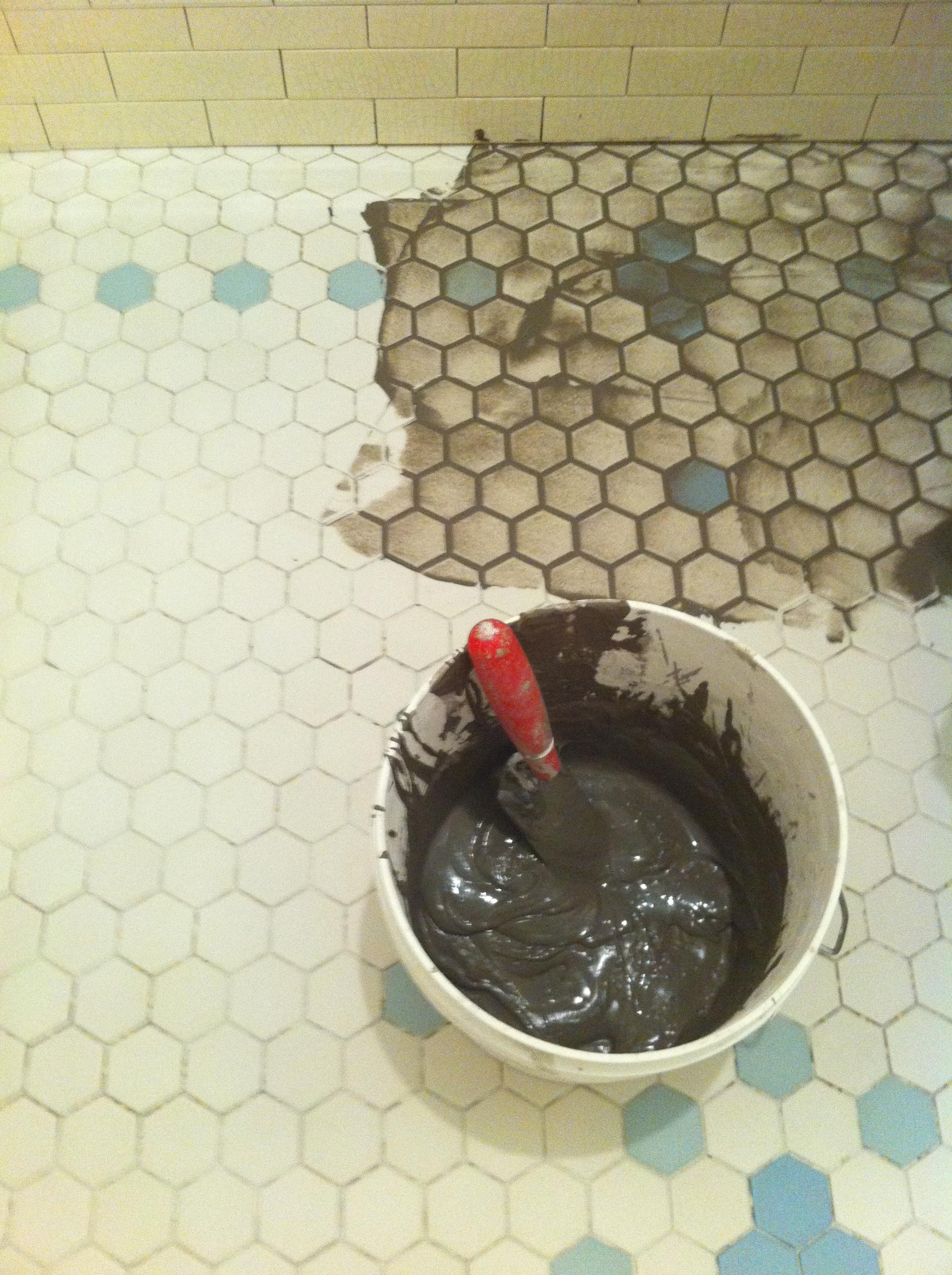 First you mix the powdered grout with water… Then you spread it on: