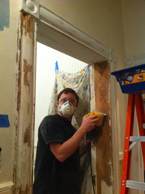 Upstairs, Rob strips and sands the existing door trim to remain: