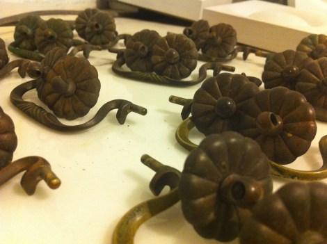 The first step to refinishing our vanity (aka an antique dresser from craigslist) was to remove the hardware and drawers, as well as take the top off (future marble top)… Keeping the hardware safe: