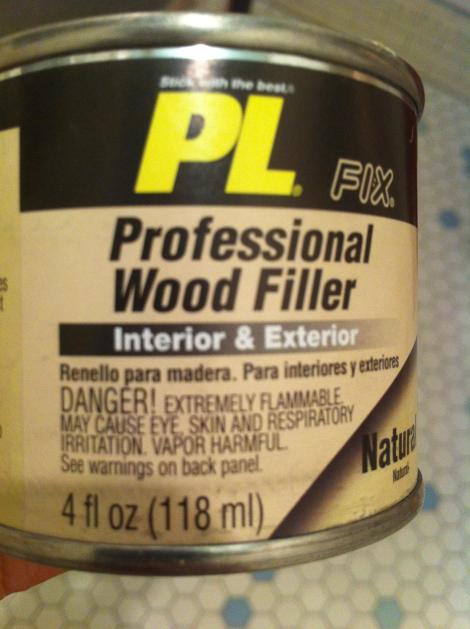 Today’s product is wood filler! Not that Elmers putty stuff – don’t get me started on how unsandable and unpaintable that stuff is. We’re talking real chemicals here, people- aka products that do what they say they’ll do while smelling awful: