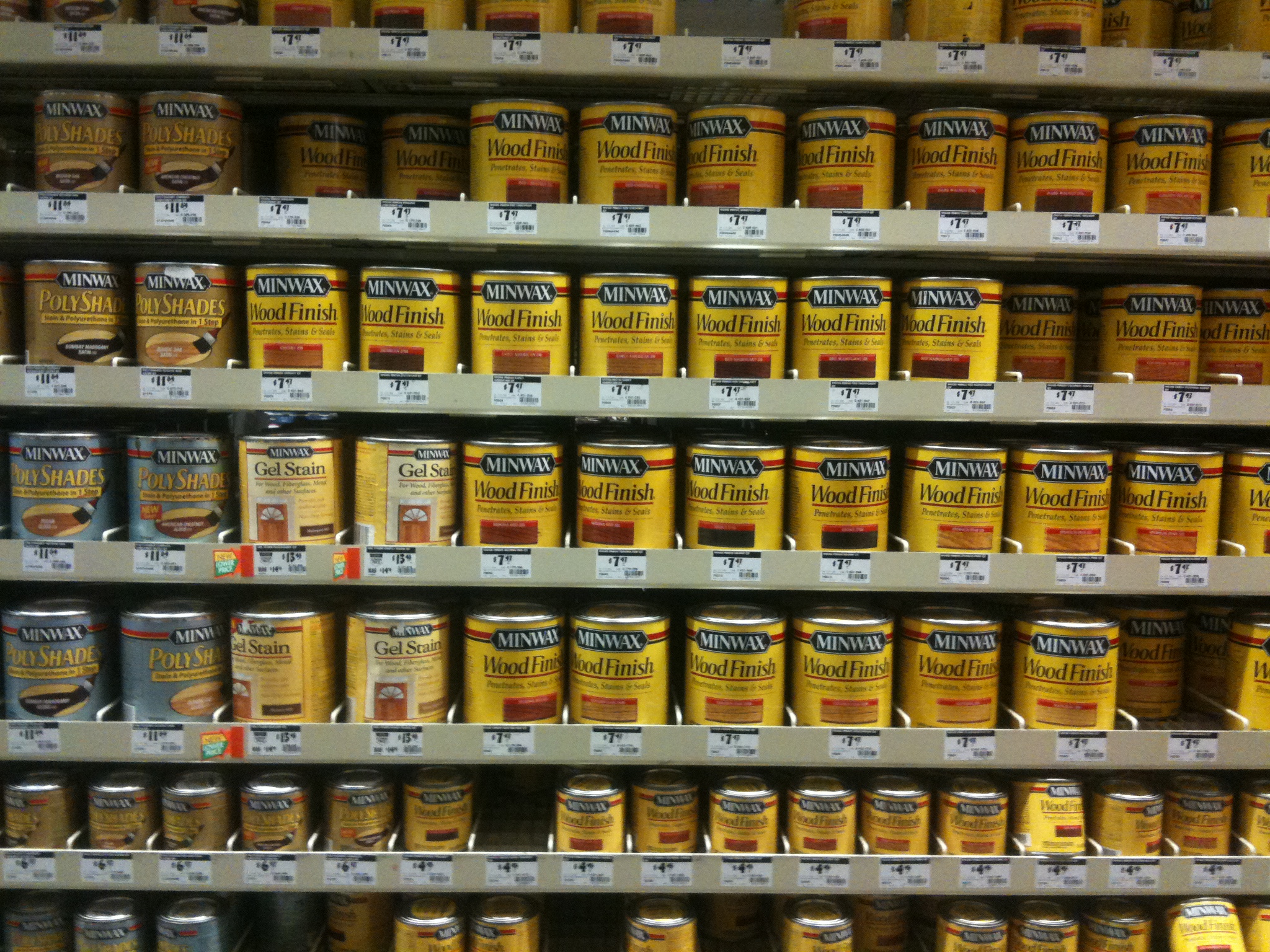 We went to get a test sample of stain for our lovely vanity- and wow. There are dozens of colors to choose from, not to mention if you want poly blended with your stain or want satin or gloss or ahh:
