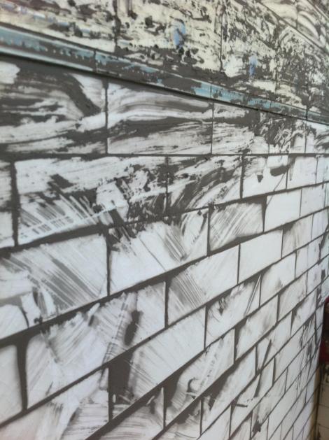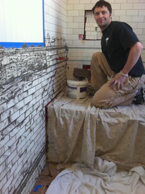 During- Rob uses the float on the flat tiles, while I glop the grout on the cap and accent tiles using a super-professional finger painting type method.