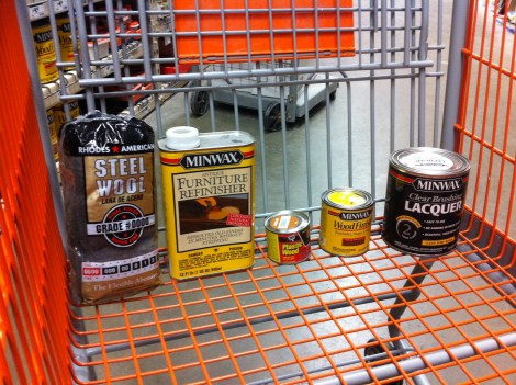 Yes, yes, so easy…Home Depot. We picked up the rest of the refinishing supplies for the vanity. From L to R: steel wool for stripping, refinisher, wood putty, stain, and lacquer.