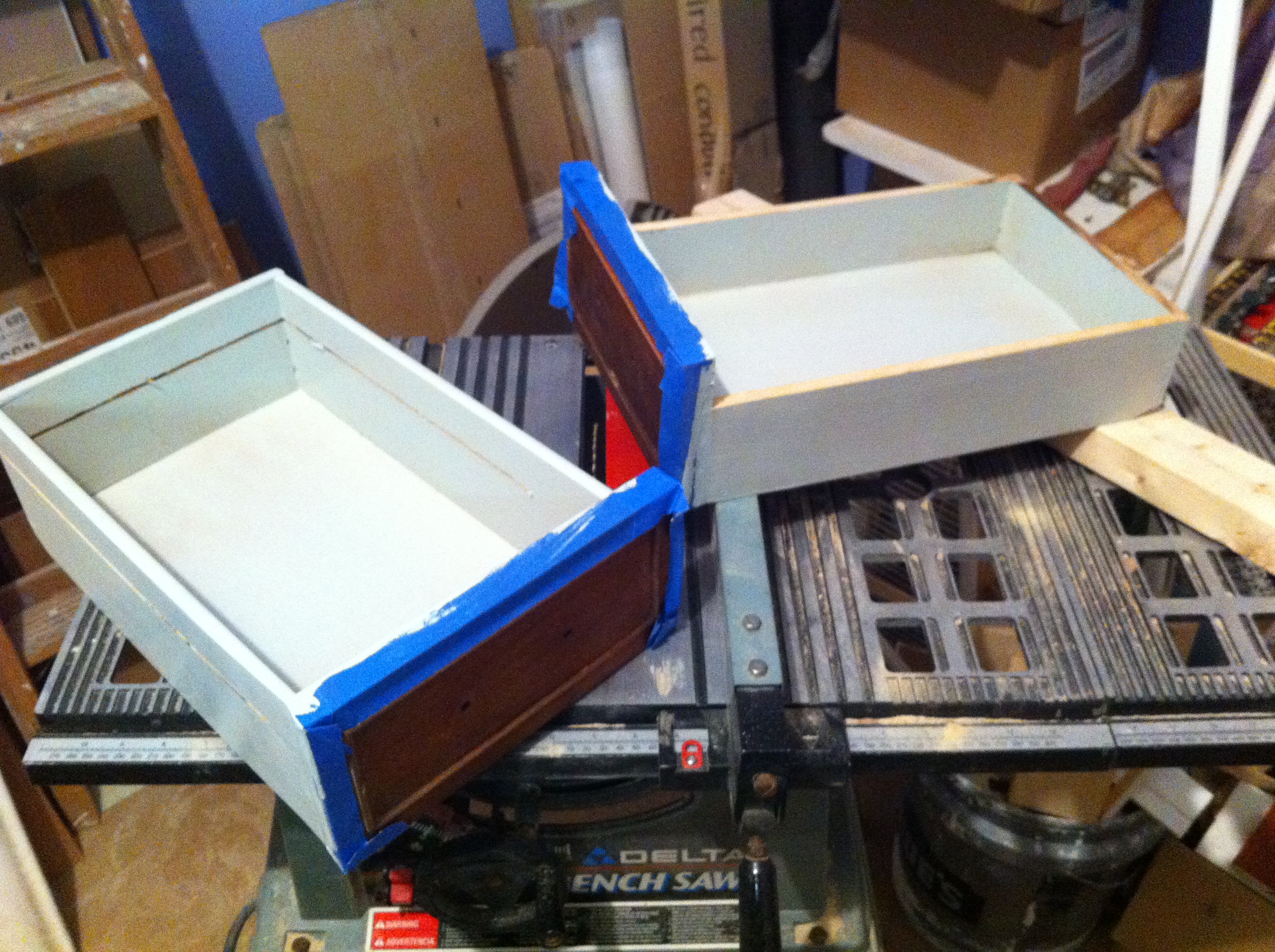 Believe it or not, this vanity is probably the most custom piece of our bathroom. Tonight we continued to take it apart and rebuild to meet our needs! Last night I primed the drawers and tonight Rob modified them as needed to fit around the plumbing in our vanity. Before: