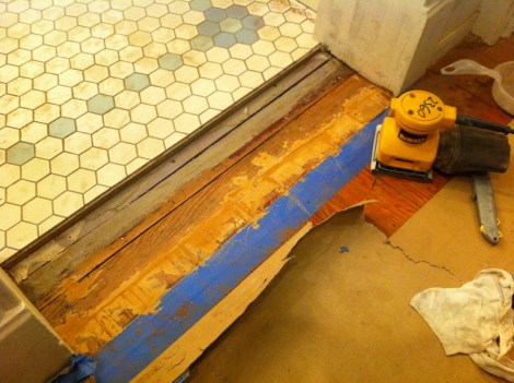 Our bathroom threshold is a week away from a brand new marble threshold, and needs some attention. Before we ransacked the bathroom it had a large 2.5″ or so high wood threshold which covered more of the hardwood hall floor. So we taped off and started freshening up by pulling/ sinking nails: