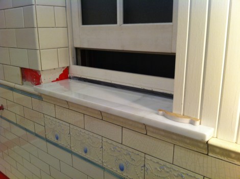 On the left hand side we are tiling up to the stone. On the right hand side is a slice of trim profile… The full version of which we’ll install once the tiling is wrapped up. Then, paint the window!